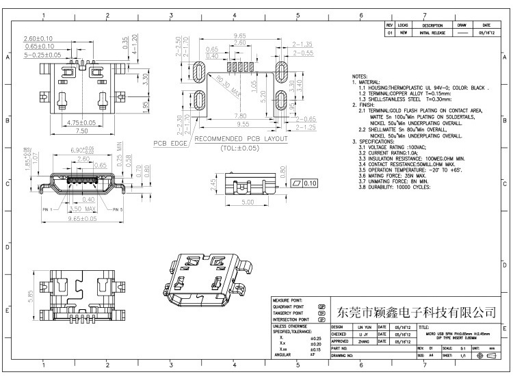 產(chǎn)品簡介:插入力:35N MAX 拔出力:10N MIN.INITIAL 8-20N AFTER 10000CYCLES 額定電流:1.5A 額定電壓:30V 耐久性:10000CYCLES MIN. 耐電壓:100V AC MIN. 接觸阻抗:30mΩ MAX.INITIAL;40mΩ MAX AFTER 10000CYCLES 絕緣電阻:100MΩ MIN 工作溫度:-30℃ TO +80℃ 膠心:LCP UL94V-0 端子:C5191,鎳底,鍍金1U 外殼:SUS
