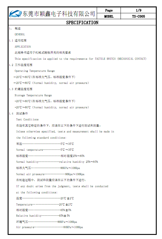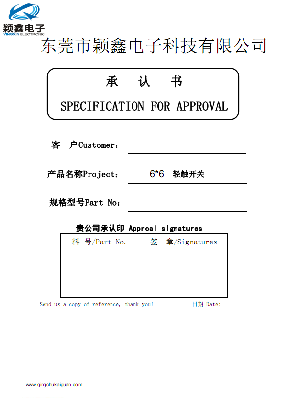 本輕觸開關(guān)規(guī)格書由穎鑫電子科技有限公司內(nèi)部資料!只適合本公司產(chǎn)品,請(qǐng)勿與市場(chǎng)上開關(guān)通用。如需求了解更多: 6*6輕觸開關(guān)規(guī)格書 , 6*6貼片輕觸開關(guān)規(guī)格書 , 6*6帶燈輕觸開關(guān)規(guī)格書 , 6*6防水輕觸開關(guān)規(guī)格書 , 6*6插腳輕觸開關(guān)規(guī)格書 ..等各系列技術(shù)參數(shù) 請(qǐng)關(guān)注www.qingchukaiguan.com或者致電0769-33373777工程部