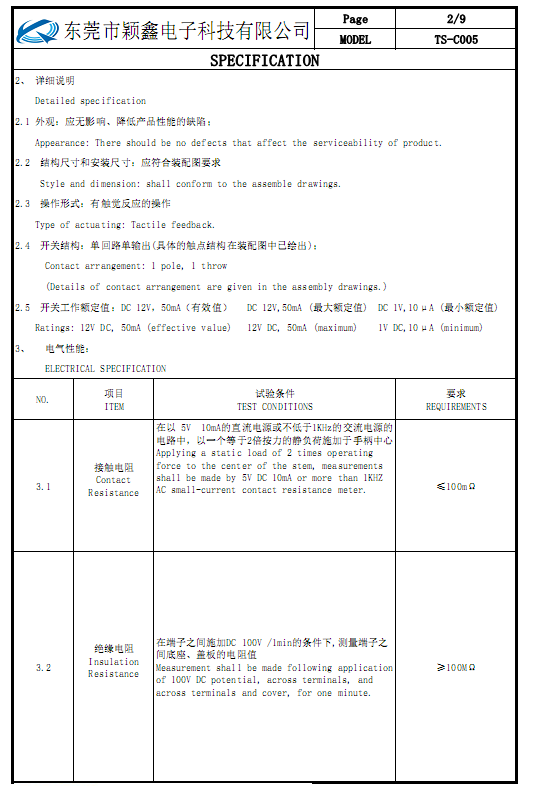 東莞市穎鑫電子科技有限公司規(guī)格書
