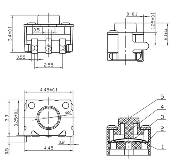 接點鍍銀、鍍金安裝形式主要有插入焊接式、嵌入插腳式、表面貼裝等。尺寸有×、6×、6×6mm、×、8×8mm、10×10mm、12×12mm等優點是適合高密度表面貼裝,有的焊接后可清洗,密封型可防塵,最適合惡劣環境選用,電路設計簡